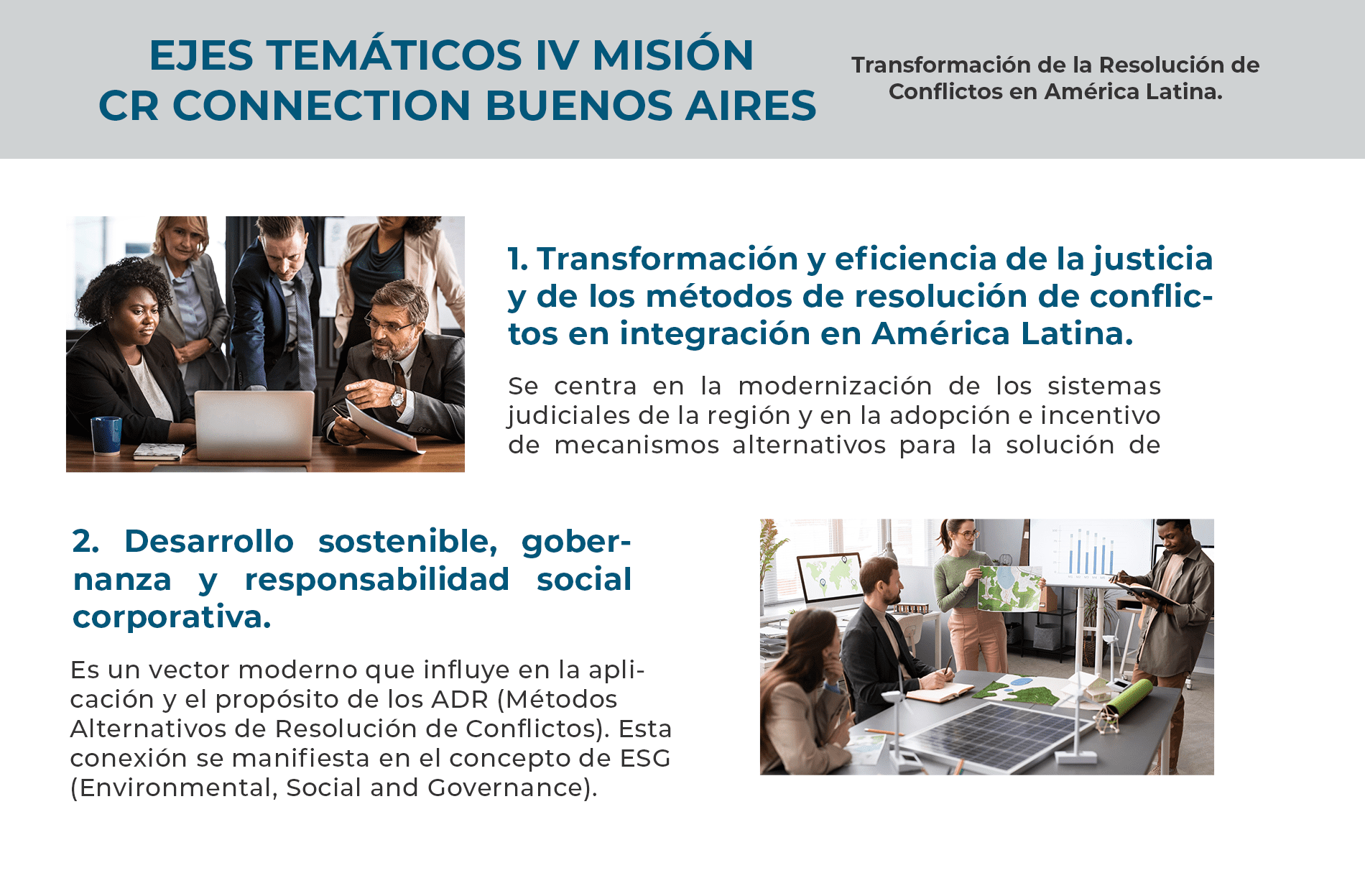 Los ejes temáticos incluyen: 1. Transformación y eficiencia de la justicia y de los métodos de resolución de conflictos en la integración en América Latina, 2. Desarrollo sostenible, gobernanza y responsabilidad social corporativa, 3. Innovación, tecnología y nuevas fronteras en ADRs, y 4. Aplicación práctica de los ADR en América Latina.