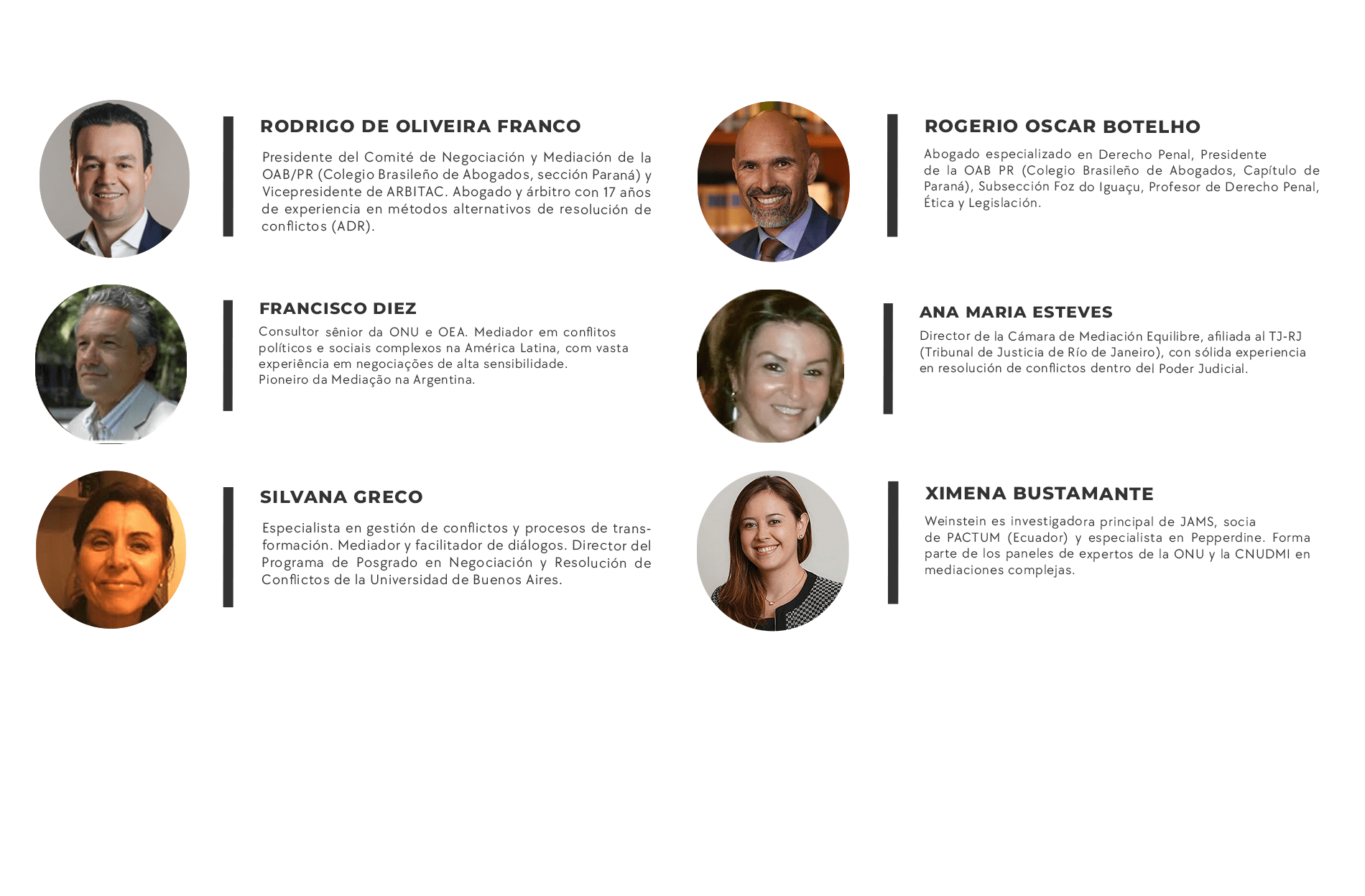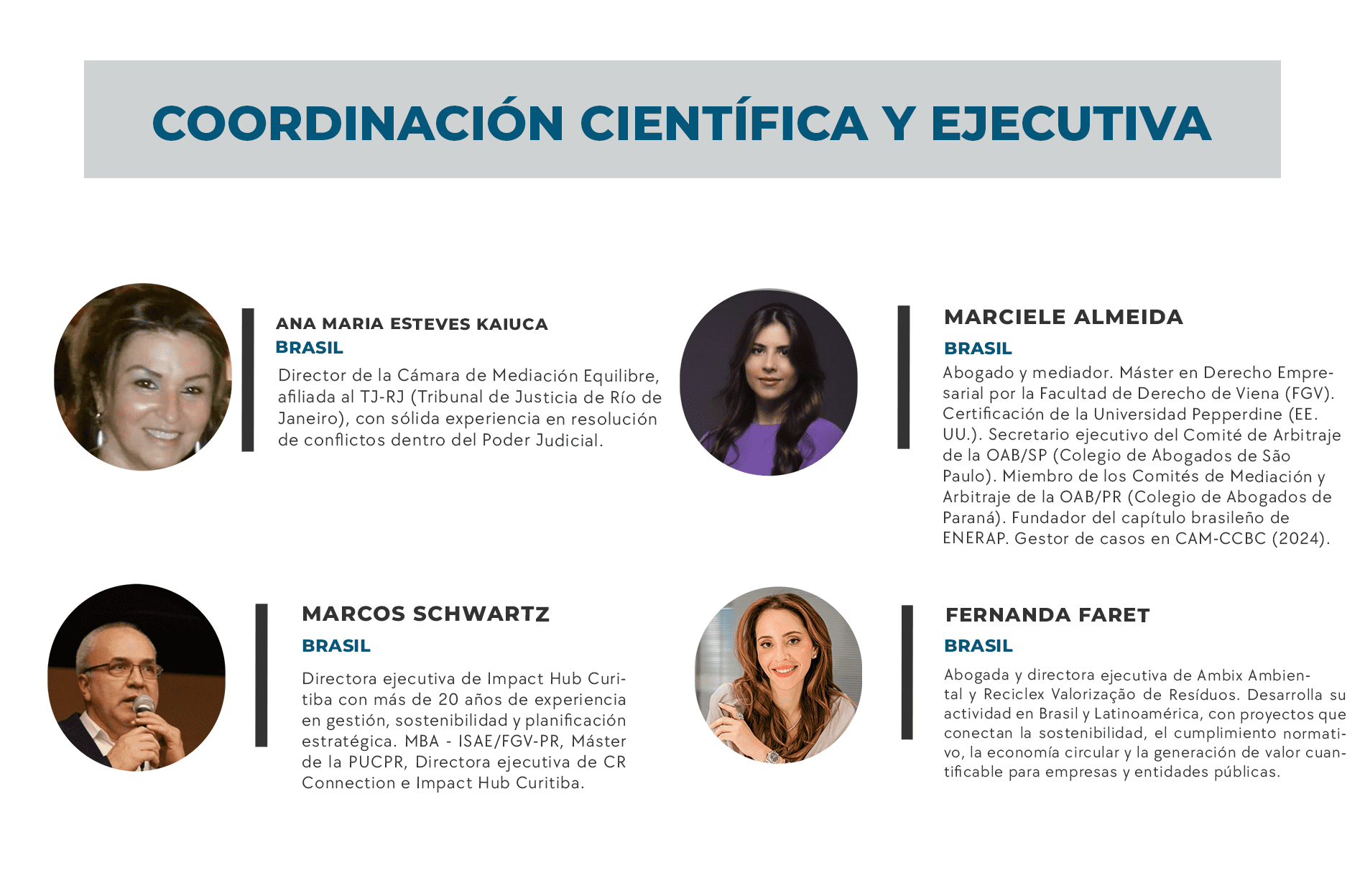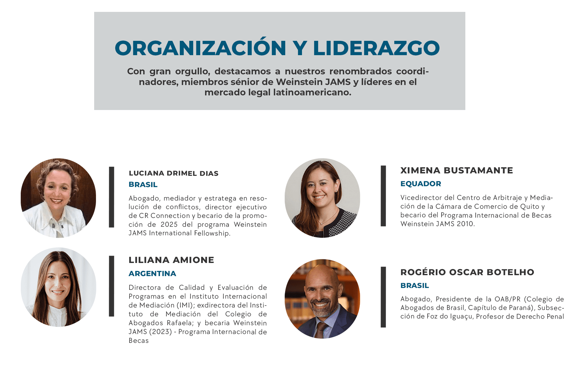 La organización y liderazgo destacan coordinadores de renombre y Fellows Weinstein JAMS, como Luciana Drimel Dias (Brasil), Liliana Amione (Argentina), Ximena Bustamante (Ecuador) y Rogério Oscar Botelho (Brasil).