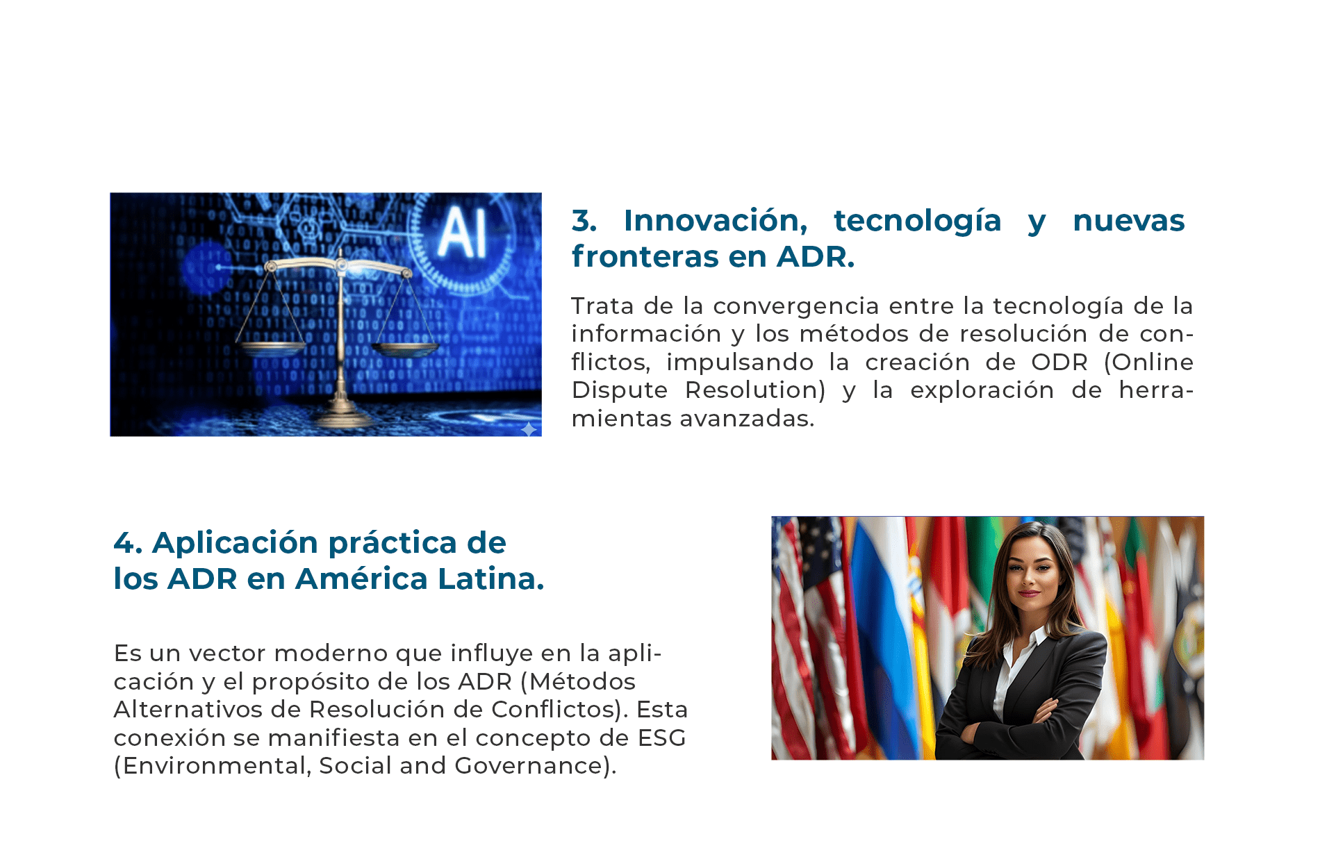 Es un Programa de Inmersión Presencial y Bilingüe con Traducción Simultánea enfocado en Mediación, Negociación y Arbitraje, con el tema central de "CONEXIONES ESTRATÉGICAS: RESOLUCIÓN DE CONFLICTOS EN LA ERA DIGITAL Y DESARROLLO SOSTENIBLE EN AMÉRICA LATINA".