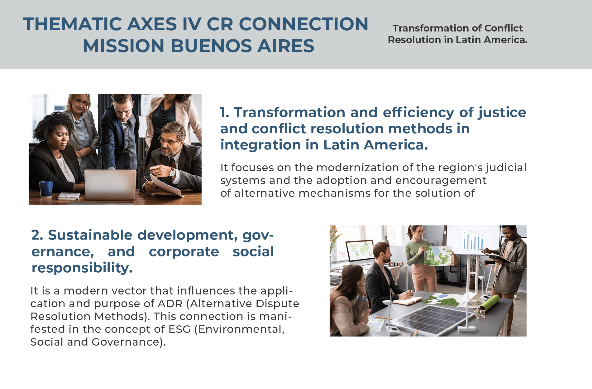 The thematic axes include: 1. Transformation and efficiency of justice and conflict resolution methods in Latin American integration, 2. Sustainable development, governance, and corporate social responsibility, 3. Innovation, technology, and new frontiers in ADRs, and 4. Practical application of ADR in Latin America.