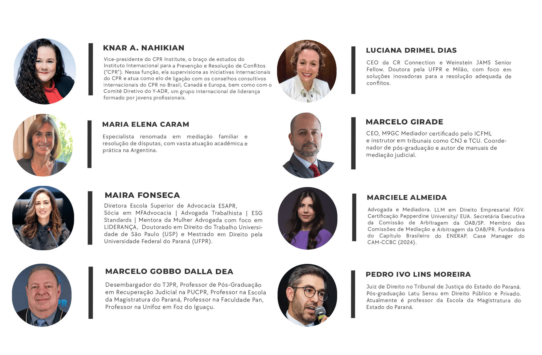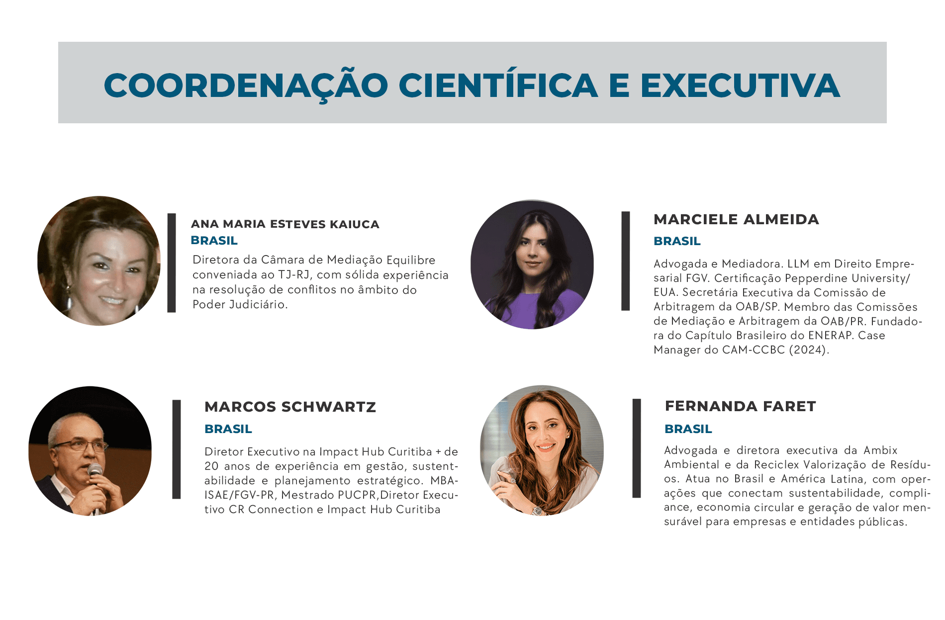 A organização e liderança destacam coordenadores renomados e Fellows Weinstein JAMS, como Luciana Drimel Dias (Brasil), Liliana Amione (Argentina), Ximena Bustamante (Equador) e Rogério Oscar Botelho (Brasil).
