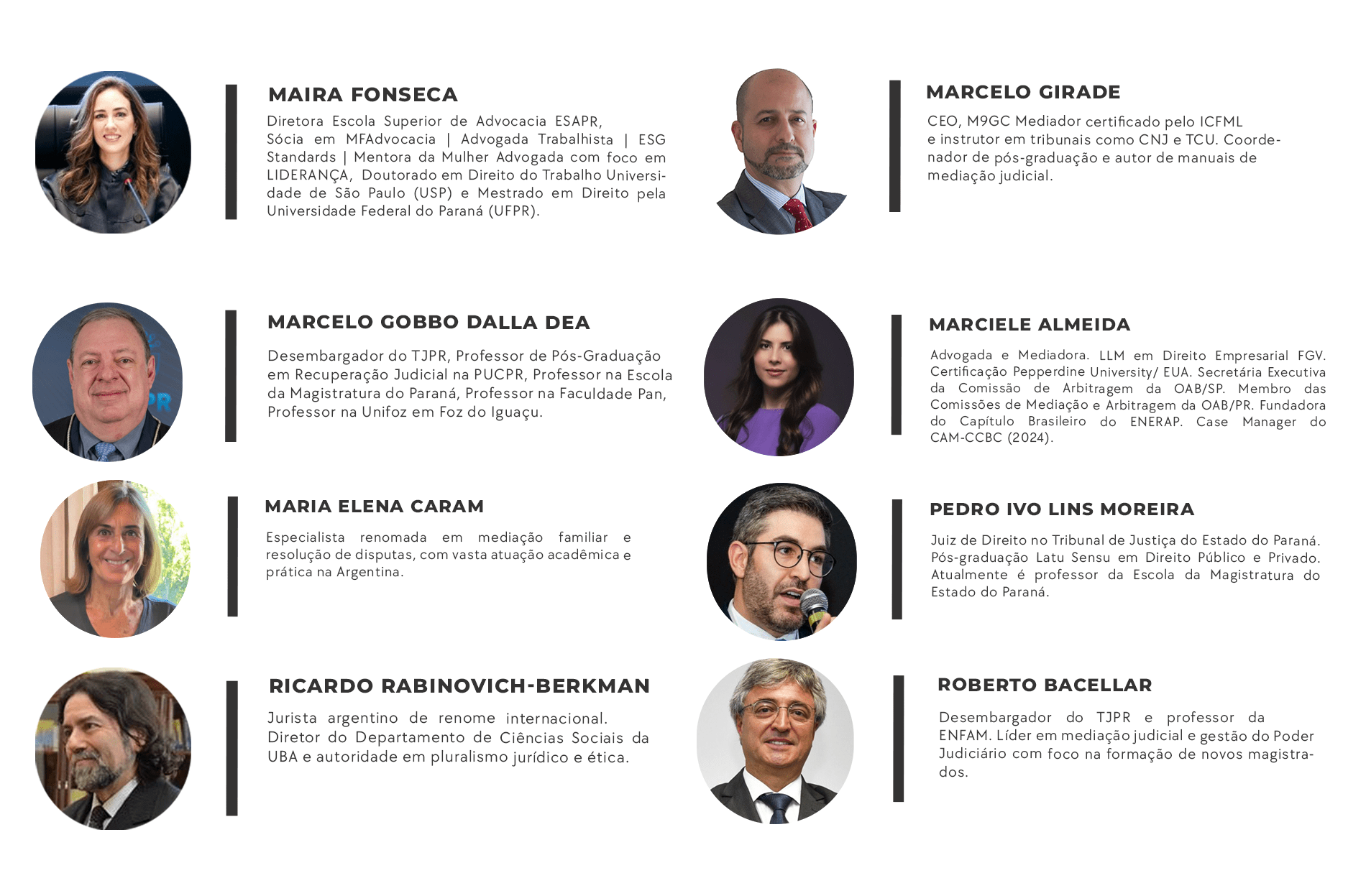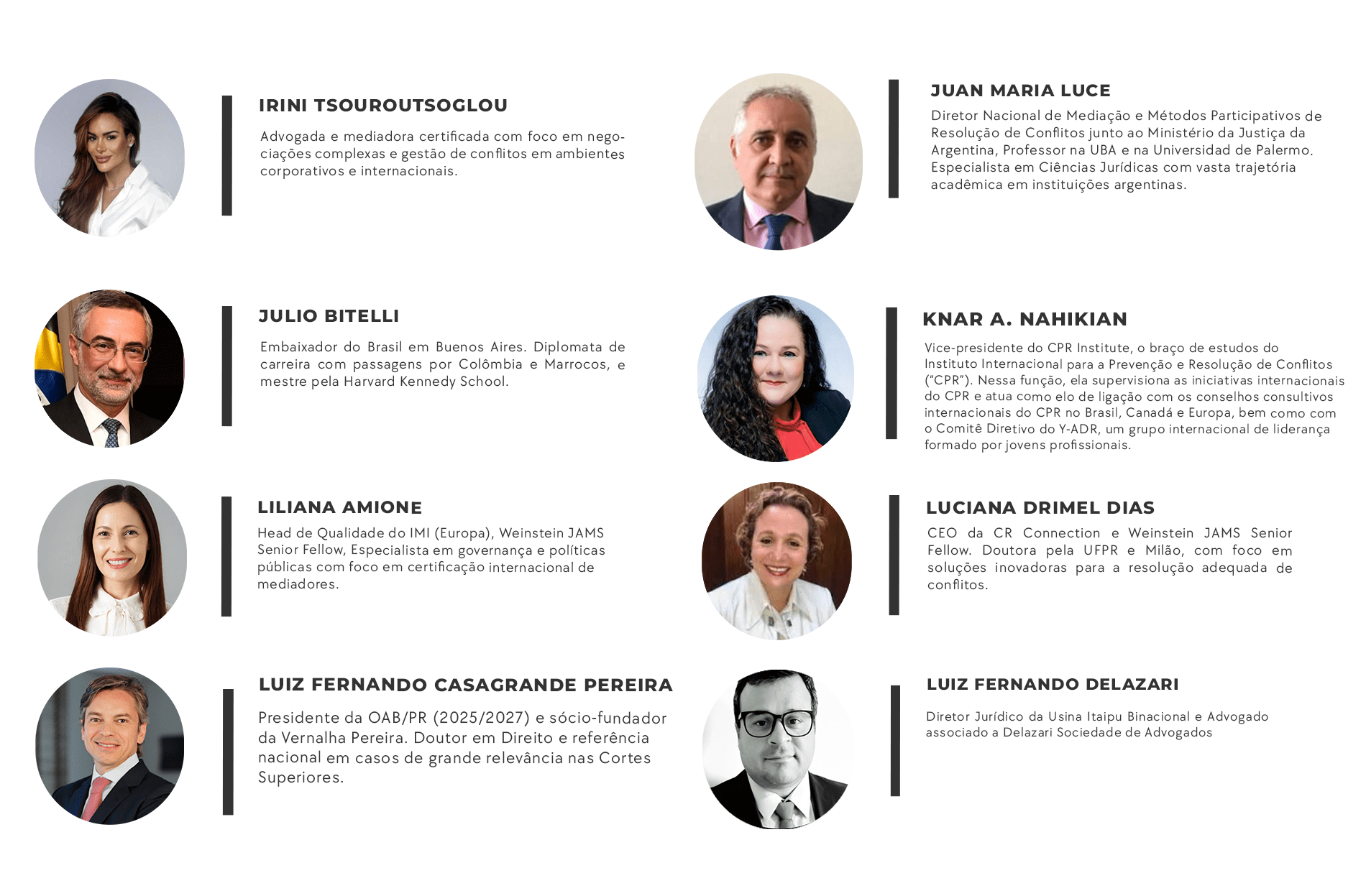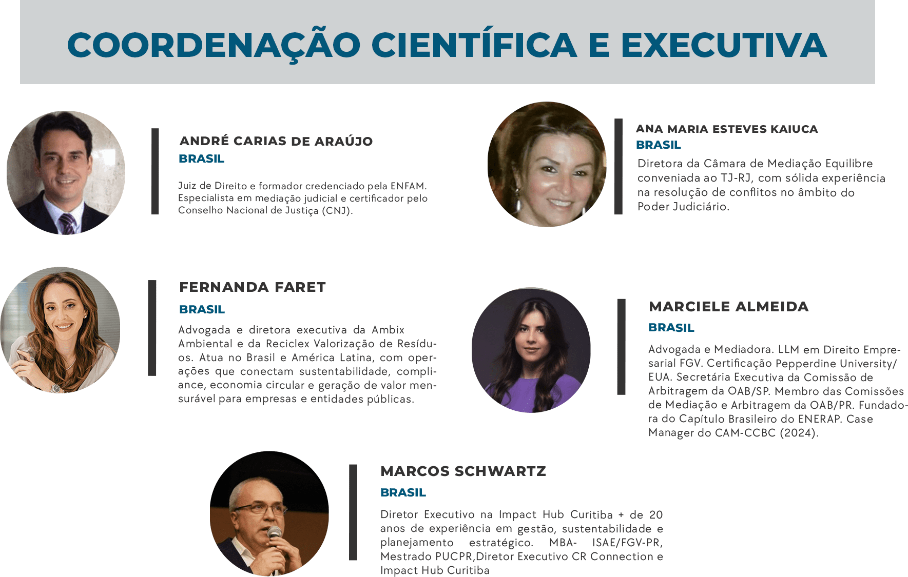 A organização e liderança destacam coordenadores renomados e Fellows Weinstein JAMS, como Luciana Drimel Dias (Brasil), Liliana Amione (Argentina), Ximena Bustamante (Equador) e Rogério Oscar Botelho (Brasil).